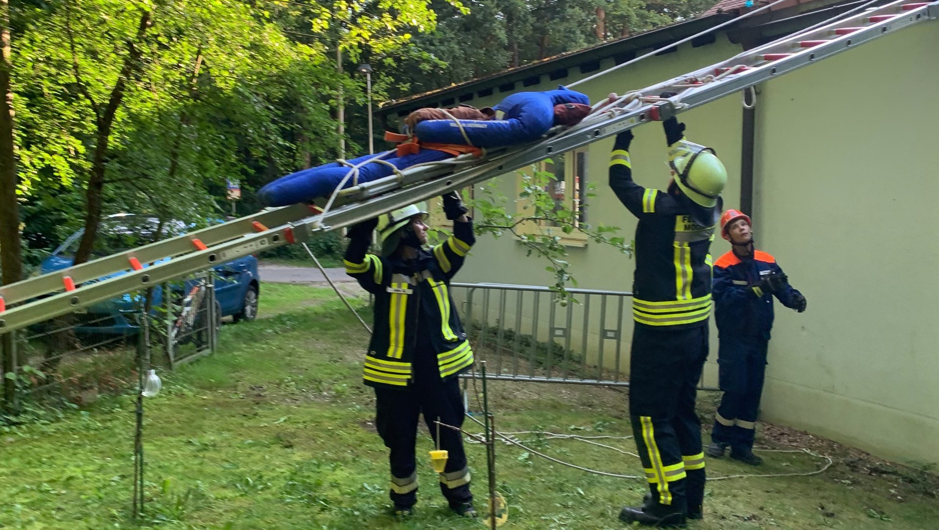 An der zweiten Station konnten verschiedene Techniken zur schonenden und achsengerechten Rettung eines Patienten von einem Flachdach mit Hilfe der vierteiligen Steckleiter ausprobiert werden. Dabei hatte jede Gruppe die Möglichkeit, eine eigene Idee auszuprobieren und anschließend gemeinsam mit den Ausbildern zwei weitere Techniken auszuprobieren. Auch hier ist eine kontinuierliche Festigung des Gelernten sehr wichtig.
