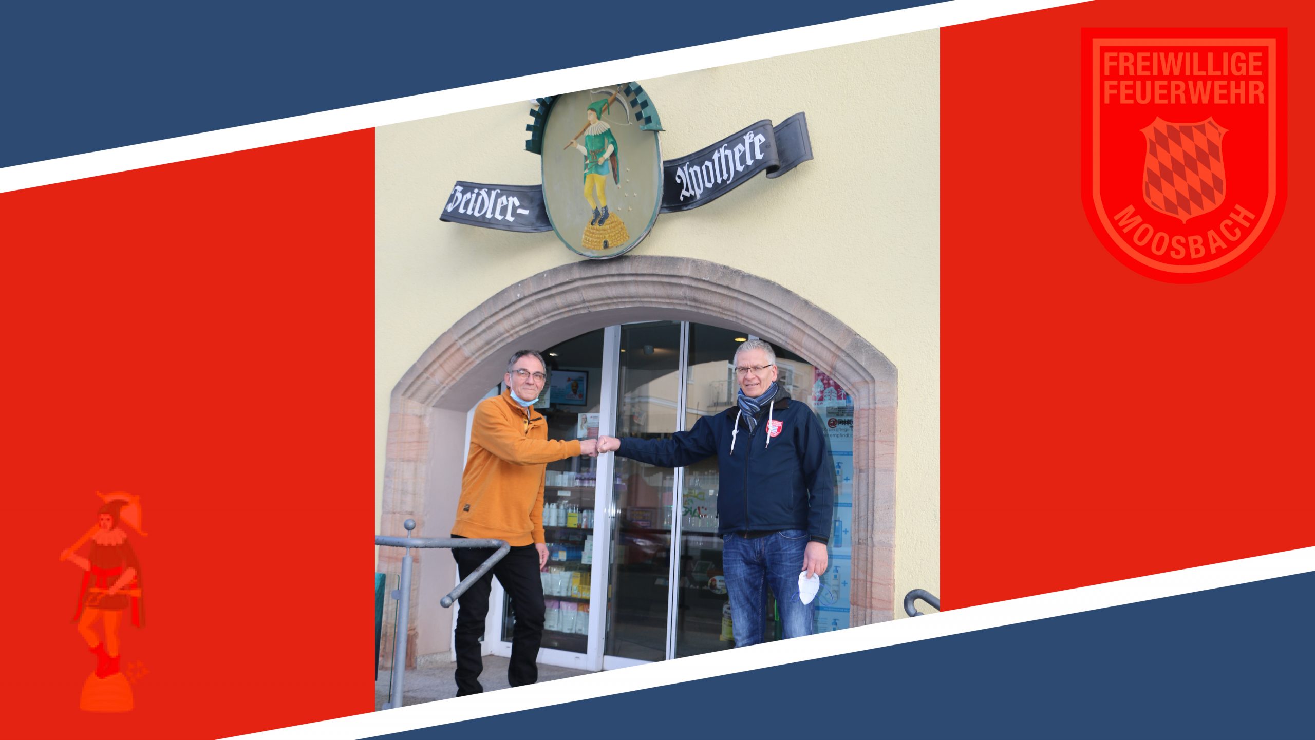 Im Bild von links, Joachim Pricken, Inhaber Zeidler Apotheke und rechts Reiner Weigl, 1. Vorstand Freiwillige Feuerwehr Moosbach e.V.