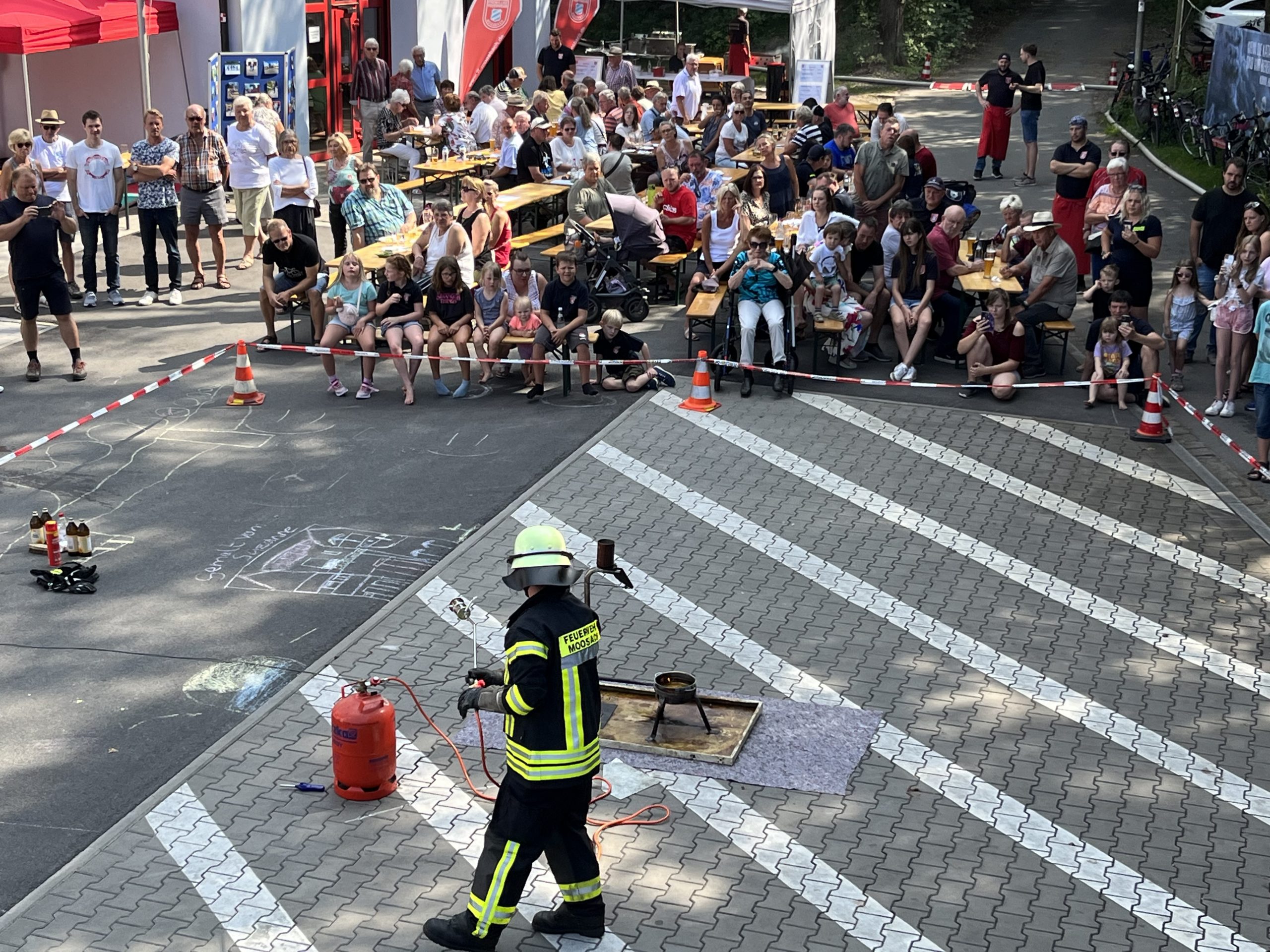 Interessierte hatten die Möglichkeit, ihre Erste-Hilfe-Kenntnisse an einer Station aufzufrischen. Die Kameraden zeigten mit einer spektakulären Demonstration, welche Gefahr im Haushalt von brennendem Öl oder Fett ausgeht, und ließen einen gewaltigen Feuerball in den Himmel steigen. Fettbrände dürfen niemals mit Wasser gelöscht werden, sondern sollen erstickt oder mit speziellen Löschmitteln bekämpft werden. Für das leibliche Wohl war gesorgt und kein Besucher musste das Fest hungrig oder durstig verlassen.